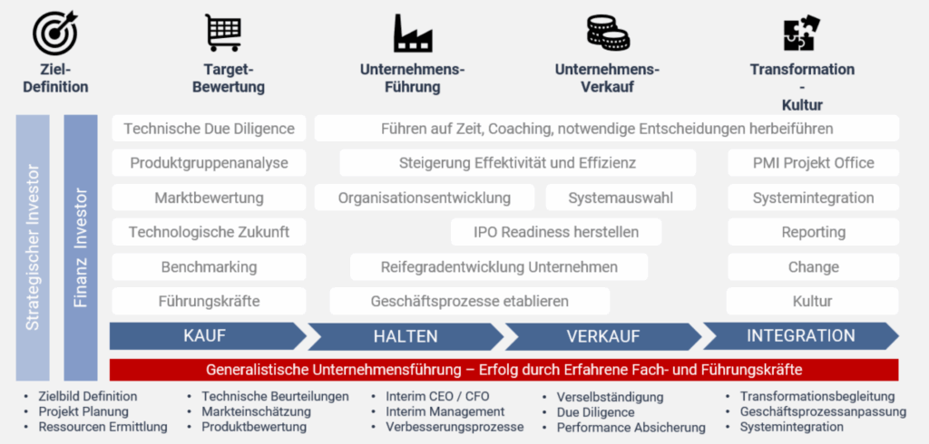 Unsere M&A Projekte bei der CREARO AG fokussieren sich auf die Wertschöpfung und Projektumsetzung durch erfahrene Experten in den Bereichen Mergers & Acquisitions. Die Leistungen umfassen den gesamten Lebenszyklus von M&A-Projekten, von der Definition der Ziele und Due Diligence über Interim Management bis hin zur Begleitung bei Kauf und Verkauf von Unternehmen oder Unternehmensteilen.